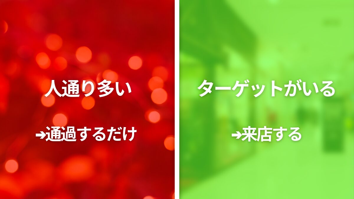 逆にターゲットと立地が合っていない場合、人通りが多くても来店につながらないことがあります。