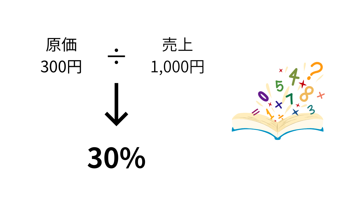 例えば、1000円の商品で原価が300円の場合、原価率は30%になります。