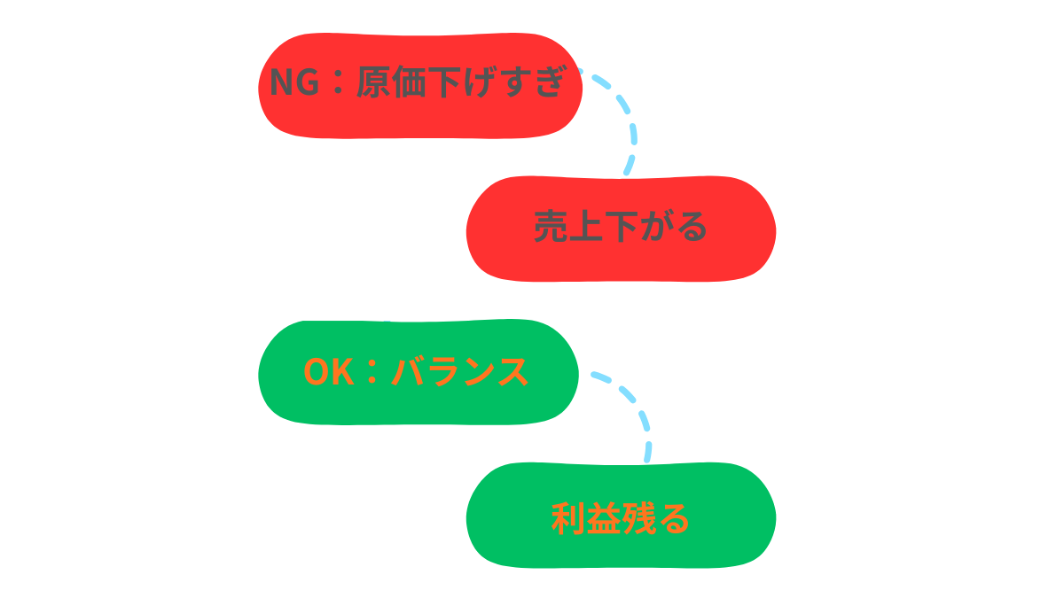 つまり、原価率だけを下げることを考えるのではなく、「売上とのバランス」を考えることが重要です。